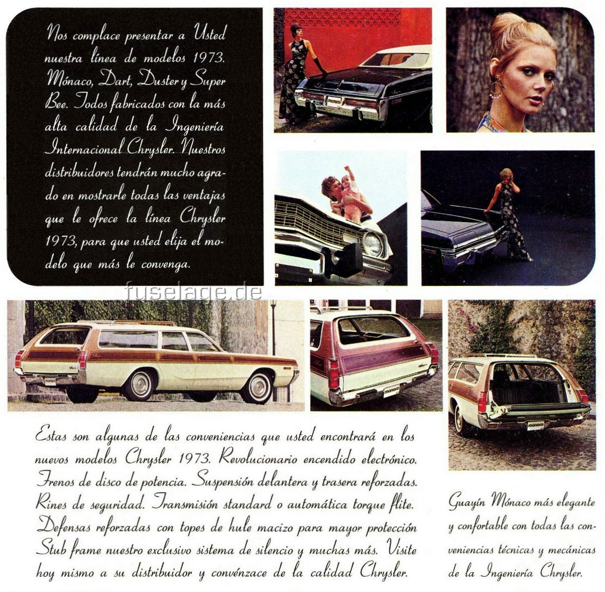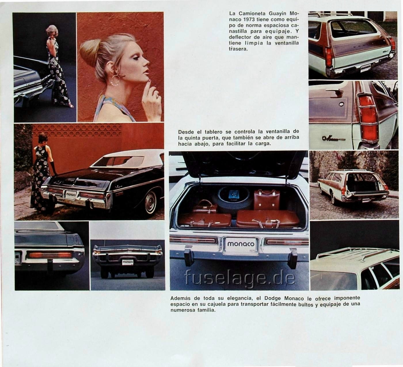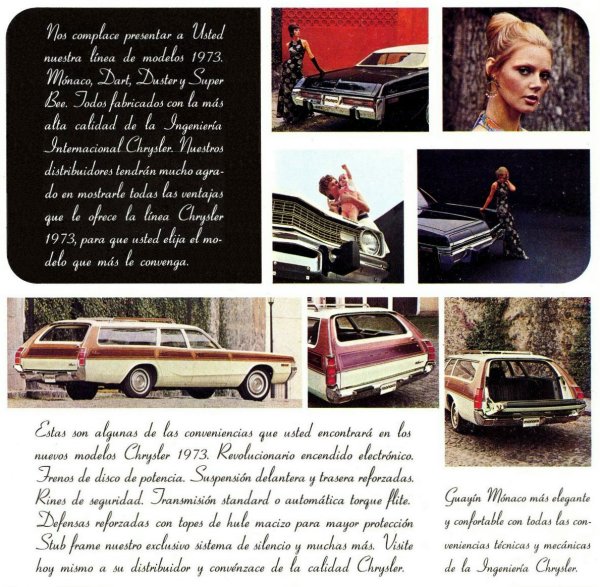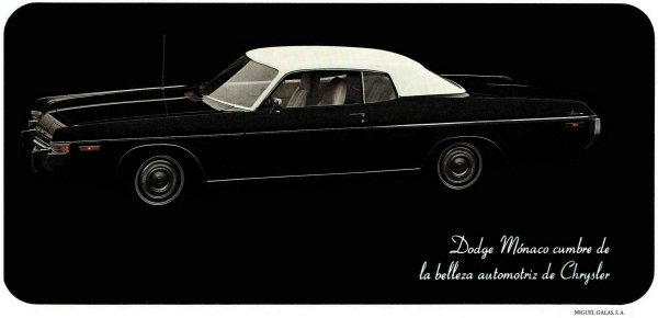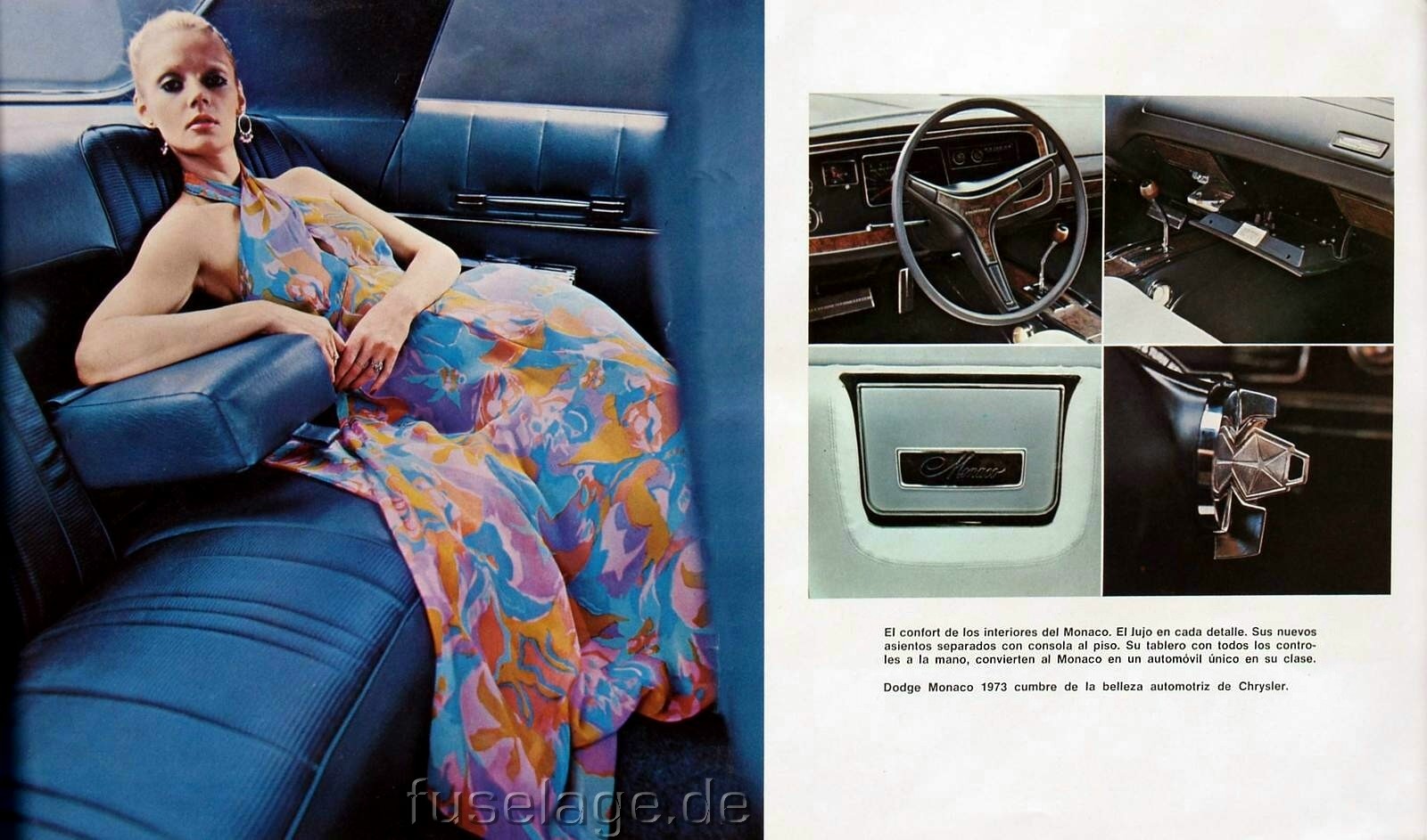 These pages are from a different Mexican folder advertising, among others, the 1973 Dodge Monaco:![]() 1973 Dodge Monaco Two-Door Hardtop |