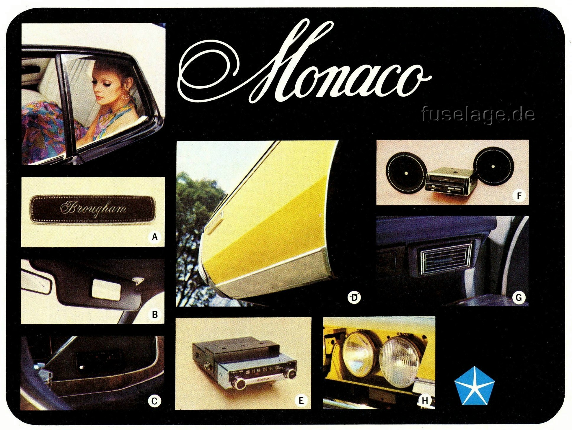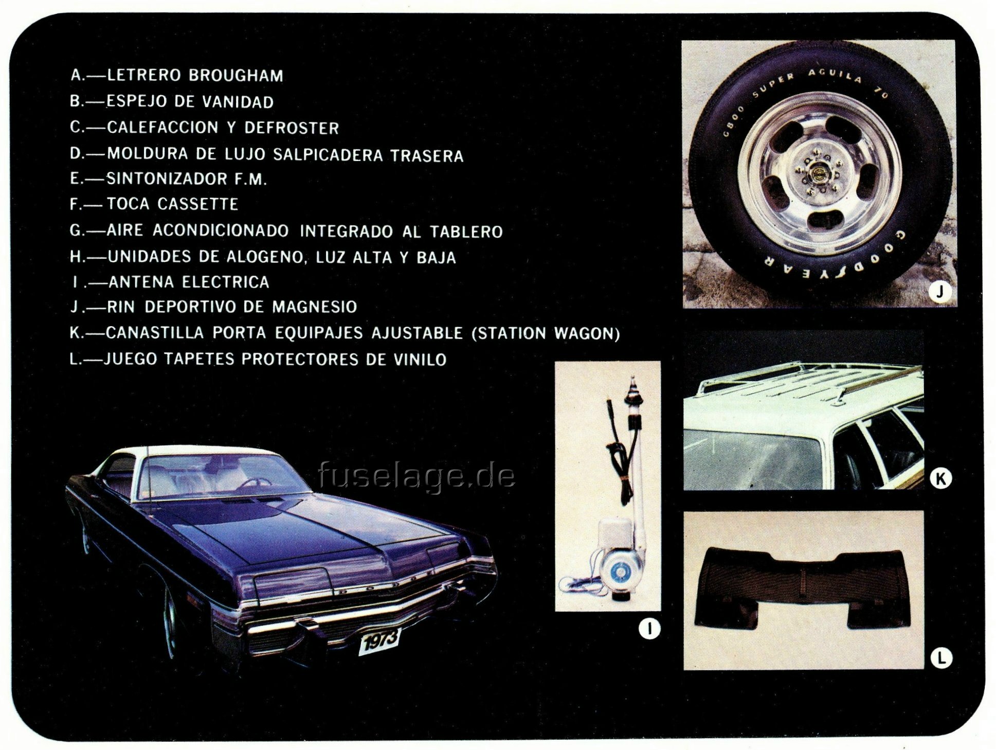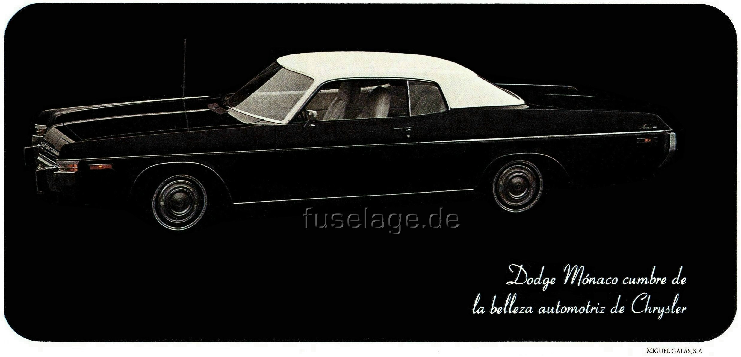 These pages are from a different Mexican folder advertising, among others, the 1973 Dodge Monaco:![]() 1973 Dodge Monaco Two-Door Hardtop |