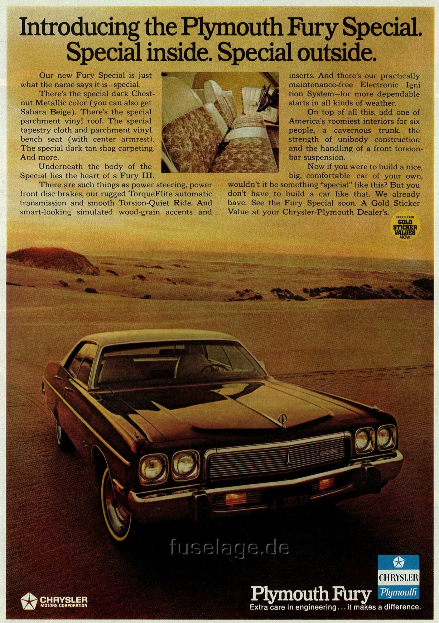 This is a print ad for the 1973 Plymouth Fury Gold Sticker special model. The 1973 Fury Special boasted special upholstery on split-back bench seat, copper-red shag carpeting, white vinyl top and dark chestnut metallic color. The chromed road wheels seen here were an option. It came standard with the 318 cui V8 engine but the 360, the 400 and the 440 cui powerplants were optional. |